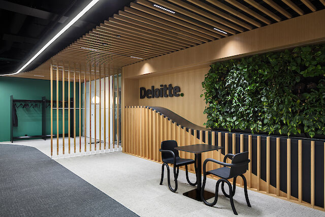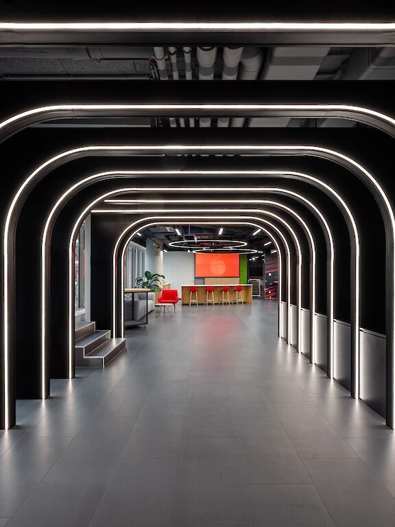 Modern office corridor with curved light line, wooden slat ceiling and lounge area with armchairs.