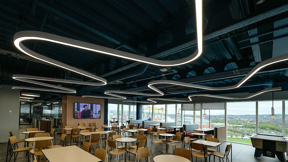 Im Herzen der Santander Bank befindet sich die Lounge, die sowohl als Kantine als auch als Besprechungsraum genutzt wird - ein Ort der Begegnung und Kreativität. Der große, lichtdurchflutete Raum verlangte nach einem eindrucksvollen Gestaltungselement, das den modernen Stil der City Quays unterstreicht und eine intelligente Lichtlösung bietet. Unsere Serie Liquid Line zieht sich in sanften Linien über die Decke und unterstreicht mit ihrer Form die Lage am Wasser. Blendfreies, gleichmäßiges Licht - energieeffizient und elegant zugleich - schafft eine behagliche Atmosphäre für Mitarbeitende und Gäste.
