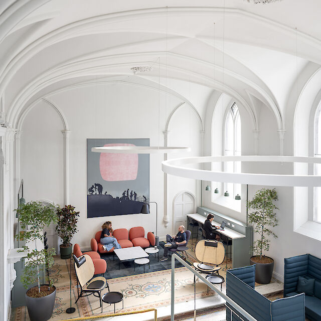 Bei der Lichtplanung wurde auf aktuelle LED-Technik gesetzt. Ein optisches Highlight bilden die weißen Pendelleuchten der Serie Ringo Star von Lightnet, die zusätzlich mit beweglichen, dimmbaren Strahlern der Serie Midpoint ausgestattet sind. Sie sorgen dank Opaldiffusor aus satiniertem Acrylglas für eine perfekte, gleichmäßige Ausleuchtung des Raums. Wie Heiligenscheine scheinen Sie im Kirchenschiff zu schweben.