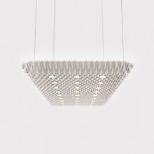 Direkt-indirekt oder rein direktstrahlend. Leuchtenkörper aus Aluminium. Schallabsorber für breites Frequenzspektrum zur Reduktion der Nachhallzeit. 3D-Textilstoff aus Trevira CS wahlweise in den Farben Cream, Taupe, Green und Anthracite. Direktanteil über Präzisionslinsen für rotationssymmetrische Lichtstärkeverteilung bei gleichzeitig hoher Blendungsbegrenzung (UGR<19) speziell für Office Anwendungen. Konverter in Leuchtengehäuse integriert, wahlweise einfach schaltbar oder stufenlos dimmbar (DALI, Touch-Dim, Casambi). Farbtemperatur 2700K, 3000K, 3500K, 4000K oder 6500K. Binning initial ≤ MacAdam 3. Farbwiedergabe CRI>80, CRI>90 oder Full Spectrum. Stufenlos höhenverstellbare Parallel-Seilabhängung mit transparent ummantelter Zuleitung. Lackierung Baldachin passend Leuchtenkörper.
