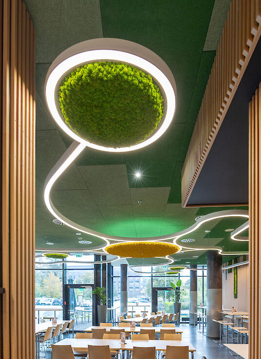 But it is not only good food that contributes to recovery, the atmosphere also plays a decisive role. A well-thought-out lighting concept brings nature into the ‘FORESTaurant’. Custom-made structures made from Liquid Line pendant luminaire with different coloured moss acoustic elements bathe the room in pleasant light and improve the room acoustics at the same time. This interplay creates a calm, relaxed atmosphere, almost like a walk in the woods. This makes the ‘FORESTaurant’ not only a place for catering, but also an oasis of relaxation in the middle of everyday hospital life.