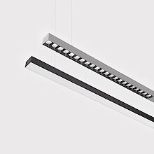 Direct-indirect or direct-only light distribution. Light channel made of aluminium profile with a width of 81mm and a height of 60mm. Bespoke lengths are possible. Surface natural anodised or white, graphite, black, champagne or copper coated. For further surface options see Lightnet-Surface-Collection or RAL of your choice. Microprismatic screen made of special acrylic glass with optimized glare reduction especially for workplaces. Satin opal diffuser for general lighting with maximum transmittance and uniformity. Wallwasher for uniform illumination of vertical surfaces. I ndirect light with innovative lens technology for wide-angle ceiling illumination. Driver integrated into luminaire housing, optionally switchable or dimmable (DALI, Touch-Dim, Casambi). Colour temperature 2200K, 2700K, 3000K, 3500K, 4000K, 6500K or Tunable White (2700-6500K). Binning ≤ MacAdam 3. Colour rendering CRI>80, CRI>90 or Full Spectrum. Height-adjustable Y-cord suspension with transparent power supply cable. Ceiling rose in matching colour to the luminaire body. On request: Integration of spotlights, emergency lighting components, sensor technology.