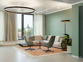 Direct-indirect or direct-only light distribution. Luminaire body made of aluminium profile with 40mm profile width. Surface white, silver, graphite, black, champagne or copper coated. For further surface options see Lightnet-Surface-Collection or RAL of your choice. Direct light using precision lenses with louvre for wide uniform symmetrical light distribution with high glare limitation (UGR<19) for workplaces. Louvre available in various colour finishes. Satin opal diffuser for general lighting with maximum transmittance and uniformity. Driver integrated into luminaire housing, optionally switchable or dimmable (DALI, Touch-Dim, Casambi). Colour temperature 2200K, 2700K, 3000K, 3500K, 4000K or 6500K. Binning ≤ MacAdam 3. Colour rendering CRI>80, CRI>90 or Full Spectrum. Height-adjustable central, parallel or disc cord suspension with transparent power supply cable. Ceiling rose to match luminaire body.