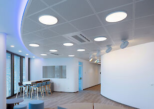 Direct-only light distribution. Surrounding mounting frame with 18mm trim overall height. 5 different diameters from 300 to 800mm. Surface white, silver, graphite, black, champagne or copper coated. For further surface options see Lightnet-Surface-Collection or RAL of your choice. Microprismatic screen with optimized glare reduction for workplaces. Satin opal diffuser for general lighting with maximum transmittance and uniformity. Driver integrated into luminaire housing, optionally switchable or dimmable (DALI, Touch-Dim, Casambi). Colour temperature 2200K, 2700K, 3000K, 3500K, 4000K, 6500K or Tunable White. Binning ≤ MacAdam 3. Colour rendering CRI>80, CRI>90 or Full Spectrum. Mounting brackets for assembly included. On request: Integration of emergency lighting components, sensor technology.