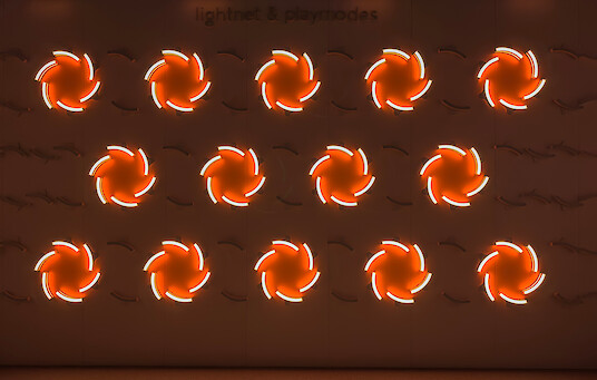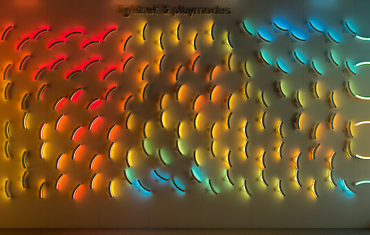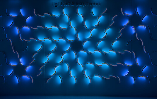 Con Liquid Tiles, Lightnet, en colaboración con el dúo de artistas audiovisuales Playmodes, ha creado una pantalla audiovisual cinética que combina tecnología, luz y movimiento en un sistema modular. La instalación consta de 126 luminarias giratorias controladas por ordenador, dispuestas en una matriz triangular definida con precisión.