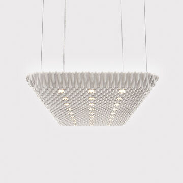 Iluminación directa-indirecta o solamente directa. Cuerpo de luminaria hecho de aluminio. Absorbente acústico interior para un amplio espectro de frecuencias que reduce el tiempo de resonancia. Tejido 3D de Trevira CS en colores crema, topo, verde y antracita. Componente directo a través de lentes de precisión para una distribución de la luz simétrica a la rotación con alta protección contra el deslumbramiento (UGR<19), especialmente para aplicaciones de oficina. Driver integrado en la luminaria, opcionalmente on-off o atenuable (DALI, Touch-Dim, Casambi). Temperatura de color 2700K, 3000K, 3500K, 4000K o 6500K. Binning inicial ≤ MacAdam 3. Índice de reproducción cromática CRI>80, CRI>90 o Full Spectrum. Suspensión de cable paralelo de altura ajustable continua con cable de alimentación revestido de forma transparente. Acabado del baldaquín concuerda con la luminaria.