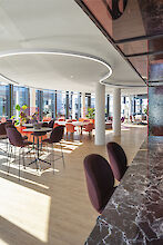 Le concept d'architecture d'intérieur Spektrum, spécialement développé, a été mis en œuvre pour une société de conseil à Düsseldorf. Le client souhaitait une image qui représente la diversité, la pluralité et l'esprit d'équipe et qui reflète l'élégance de la ville. Le design s'inspire de l'image d'un « village olympique » où différentes disciplines se rejoignent en termes d'espace et de contenu. Les couleurs spectrales violet, bleu, vert, jaune, orange et rouge constituent l'élément central du design. Elles accompagnent le plan ouvert et différencient les différentes zones fonctionnelles.