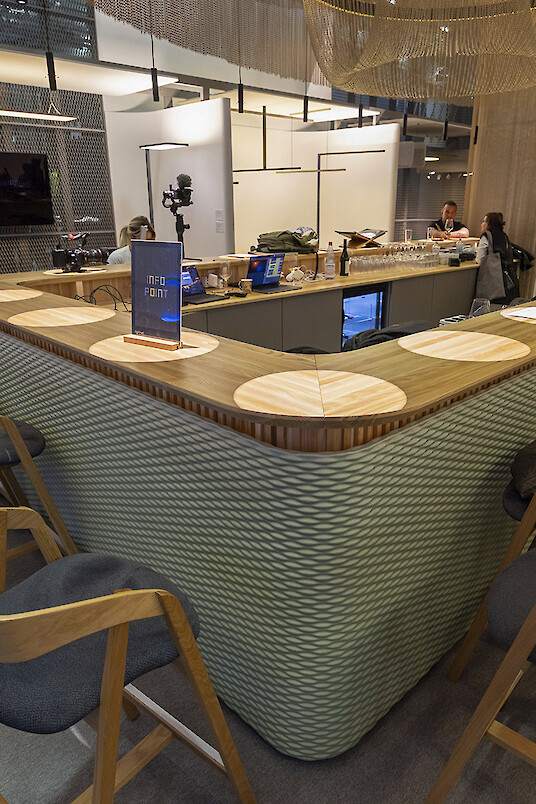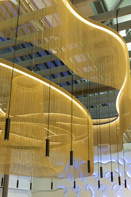 The centerpiece of the exhibition stand is the large-format light installation, which we realized together with Playmodes. It shapes the space not only visually, but also atmospherically. As a moving structure of light and form, it translates technical precision into an almost organic dynamic. In its dimension, complexity, and integrative planning, this installation is a unique project within our exhibition presence. The rest of the stand architecture also stands out confidently and complements the installation with a space-defining element. In the bar area, Liquid Line and Ringo Star merge with filigree metal chains to form a floating light architecture that balances transparency and structure. The reduced profile of the light lines meets movable metal links that do not shield the light, but make it tangible.